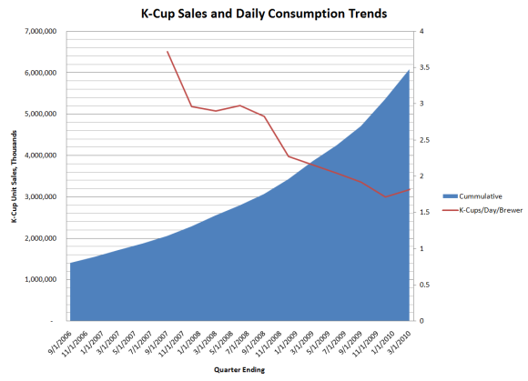 As you can see from the table to the left, Keurig has sold almost 6 billion K-cups the last few years and about 3 billion in 2009 alone. If you put all of these K-Cup ® Packs end to end you would have a string of them 166,000 miles long. Thats over 6 times around the earth.
