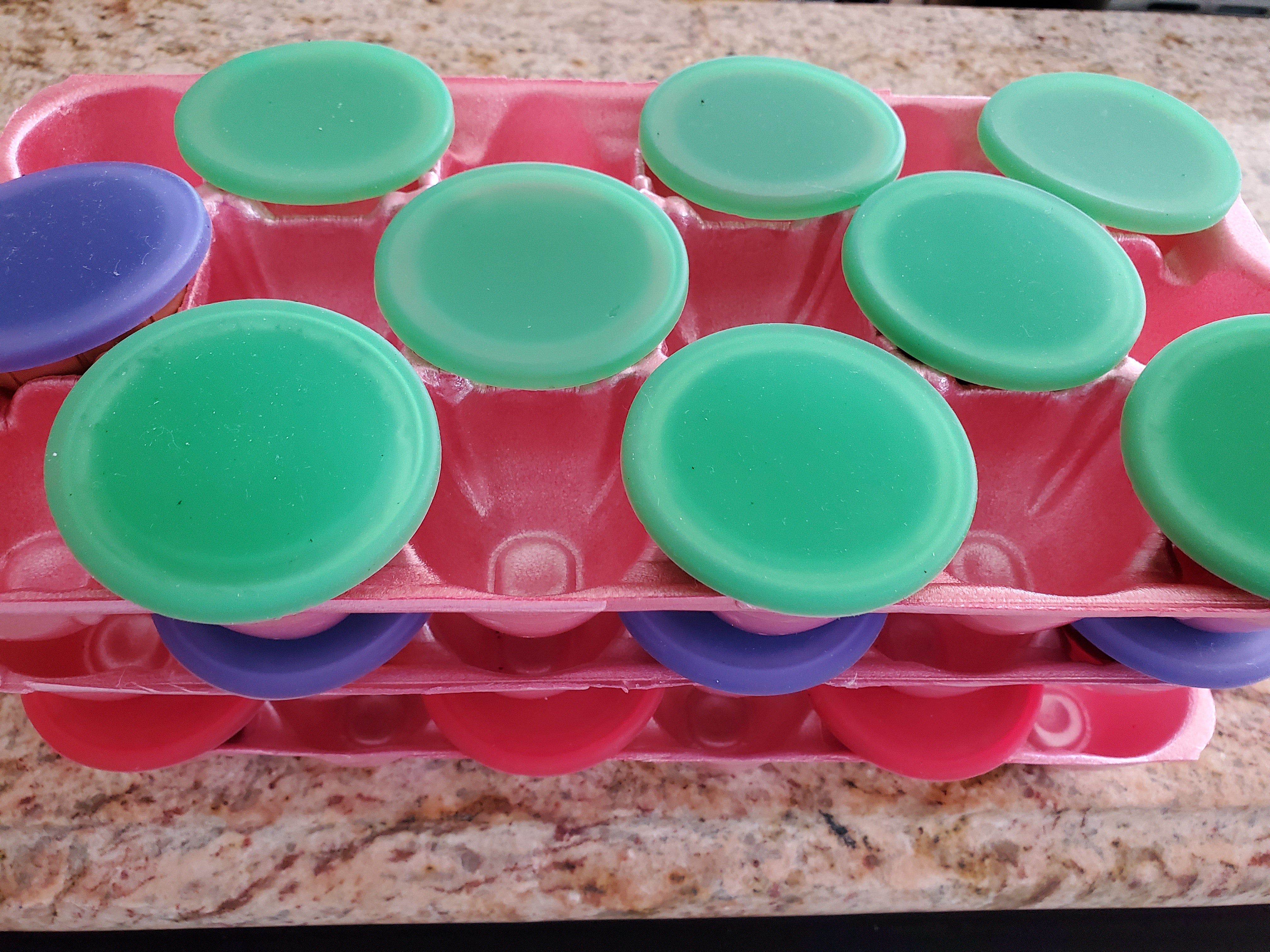 I make 24 servings at a time - 8 green, 8 blue and 8 red – and stack them in egg crates (crate lids removed).